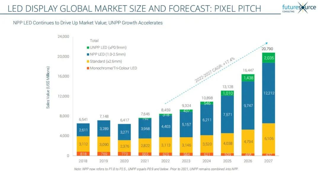 Futuresource报告显示,2022年全球LED显示市场达到85亿美元,与2021年相比增长了10.6%。Futuresource预计2023年全球LED市场的收入将增长10.2%,达到93亿美元。五年预测显示,到2027年,复合年增长率(CAGR)将达到17.4%,市场规模将增至208亿美元。K8凯发作为国家制造业单项冠军,对显示行业未来发展充满信心。